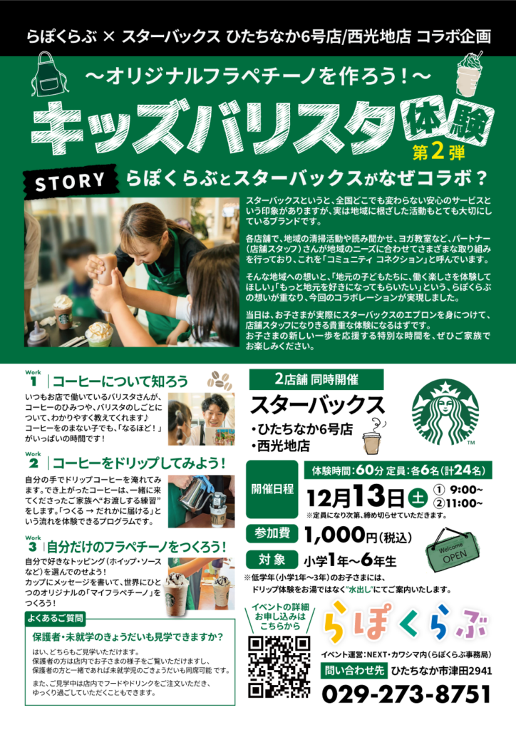 今年の8月、地元の子どもたちが“お店で働く”を体験できる特別イベント「キッズバリスタ体験」 をらぽくらぶとのコラボで初めて開催しました。