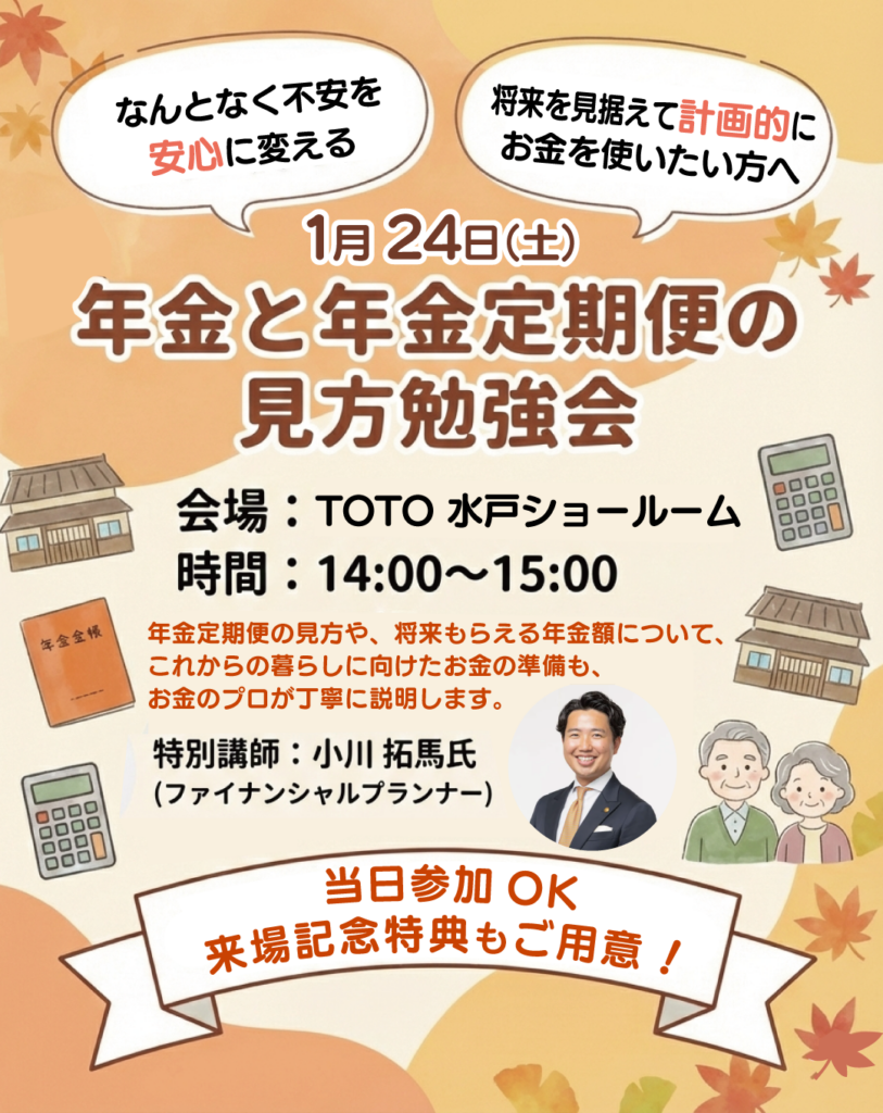 これからの資金、「なんとなく不安」なままにしていませんか? TOTO水戸ショールームにて、FP(ファイナンシャルプランナー)を招いた初の勉強会を開催します!